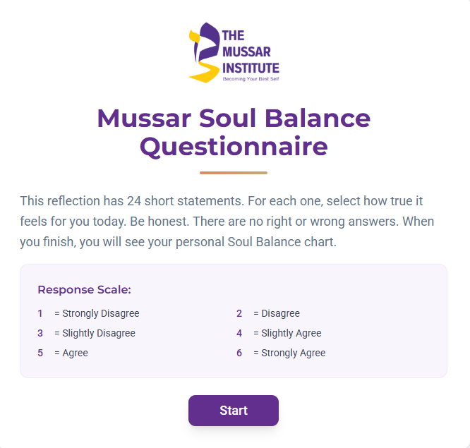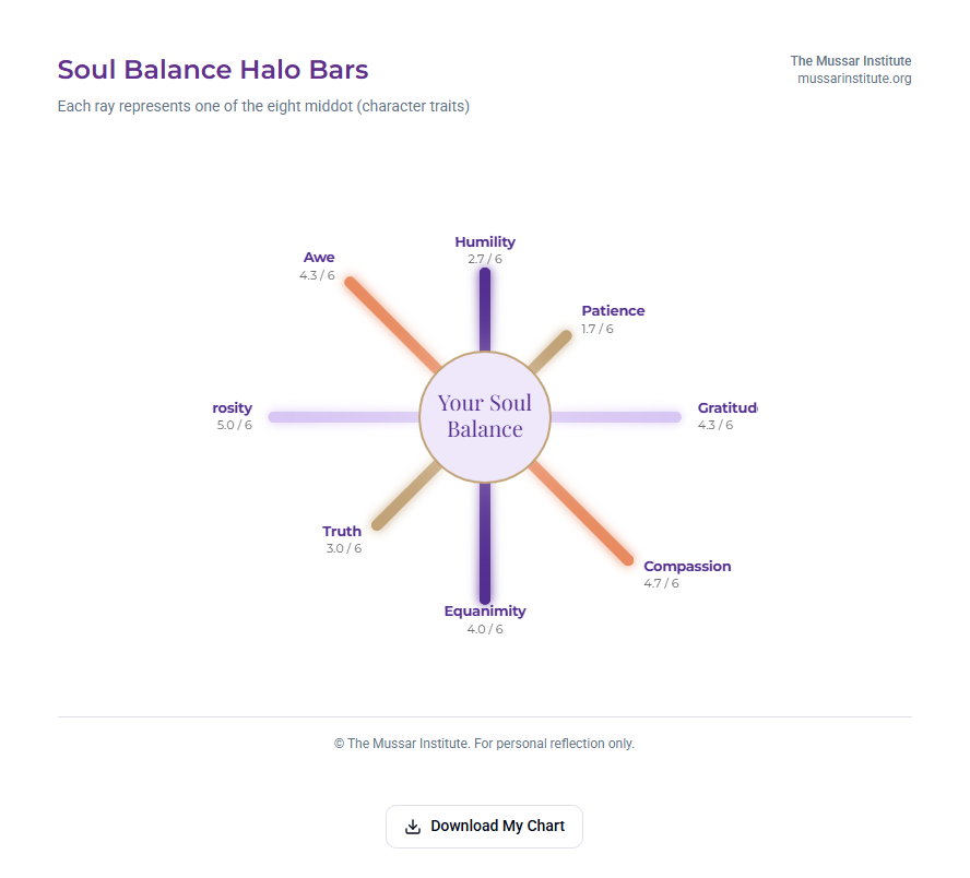 The Mussar Soul Balance Questionnaire is a tool for reflection and growth. It is not a medical or psychological test. Your answers stay private and are only used to create your chart. Nothing is saved or shared.